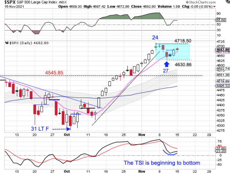 If stocks broke above he day 27 high of 4718.50, that would have shifted the odds of stocks entering a melt-up phase. However, stocks closed lower on the day. Monday was day 30 for the daily equity cycle, placing stocks in their timing band for a DCL. Any bearish follow through should send stocks to complete their daily cycle decline. Stocks should break below the day 27 low of 4630.66 and turn the 10 day MA lower in order to complete its daily cycle decline. This would allow stocks to backtest the 4545.85 breakout level and allow sentiment to cool off. Which would set stocks up to emerge from a DCL heading into the most bullish time of the year.
