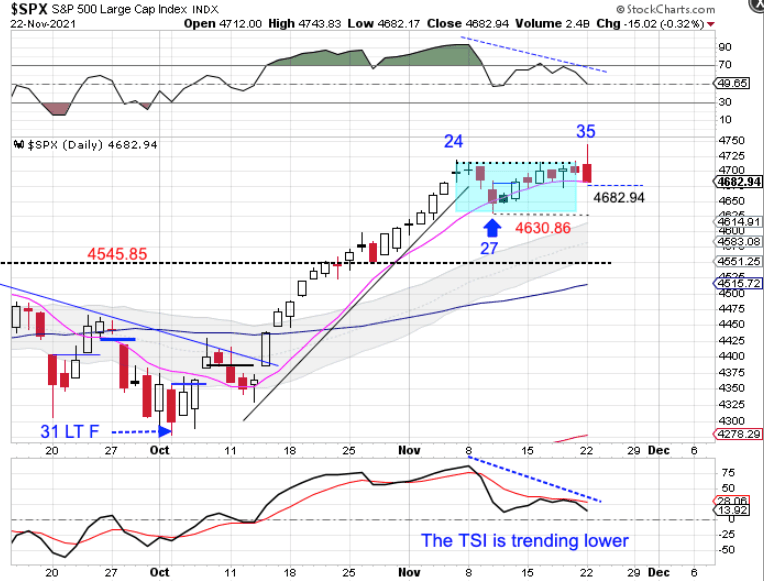 Monday was day 35 for the daily equity cycle, placing stocks in their timing band for a daily cycle low. Monday’s bearish reversal eases the parameters for forming a daily swing high. A break below 4682.94 will form a swing high. Then a close below the 10 day MA will signal the daily cycle decline. Stocks should go on to break below the day 27 low in order to complete its daily cycle decline. Stocks are in a daily uptrend. Stocks will remain in their daily uptrend unless they close below the lower daily cycle band.