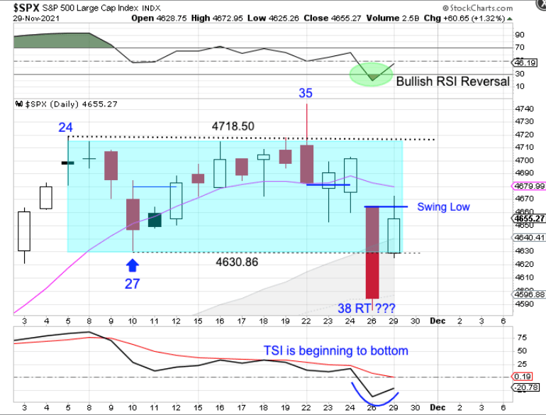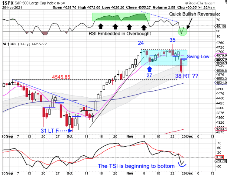 Stocks have been in a daily uptrend that has been characterized by highs occurring above the upper daily cycle band and lower forming above the lower daily cycle band. Another characteristic is having RSI become embedded in overbought. Monday’s quick bullish RSI reversal is a signal that stocks will resume their daily uptrend. Stocks did form a swing low on Monday. A close above the 10 day MA will indicate a continuation of the daily uptrend and trigger a cycle band buy signal.