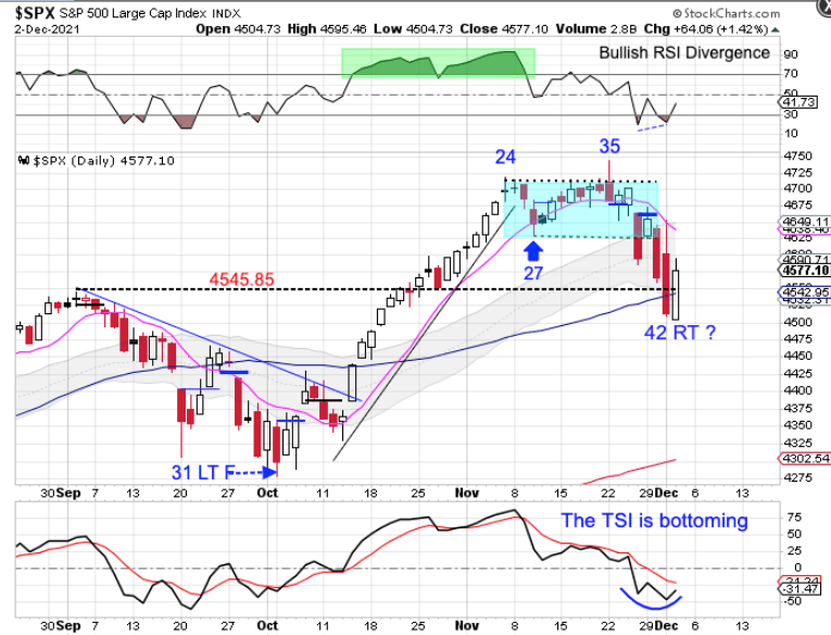 Stocks broke below the September breakout level on Wednesday to close below the 50 day MA. Stocks then broke lower on Thursday to print a bullish reversal. Thursday was day 42, placing stocks in their timing band for a DCL. Technically stocks still need to form a swing low. However, recovery of the September breakout level and the rising 50 day MA signals a new daily cycle.
