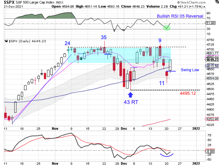 Stocks formed a swing low on Tuesday. Stocks are currently in a daily uptrend. Forming a swing low above the lower daily cycle band indicates a continuation of the daily uptrend and triggers a cycle band buy signal, using Monday’s low as the stop. Positions can be added to with a close above the 4715 resistance level.