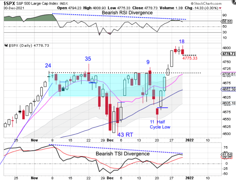 While stocks are at all-time highs, there are bearish divergences developing on the oscillators, which often herald a cycle decline. If stocks form a swing high and close back below the breakout level that will signal the daily cycle decline. And if this breakout fails I think that will also trigger the intermediate and yearly cycle declines, which I plan to further discuss in the Weekend Report.