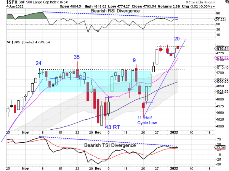 A bullish break above resistance could send stocks to 4900 or even 5000. But as we discussed with stocks being overdue for their yearly cycle decline, rejection here may set the ‘dominos’ in motion to lead to the intermediate and yearly cycle declines.