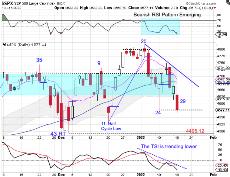 Stocks broke below the day 24 low on Tuesday to extend the daily cycle decline. Stocks also closed below the lower daily cycle band on Tuesday. Closing below the lower daily cycle band ends the daily uptrend and begins a daily downtrend. Closing below the lower daily cycle band also indicates that the intermediate cycle decline has begun. A break below the previous daily cycle low of 4495.12 will form a failed daily cycle, confirming the intermediate cycle decline.
