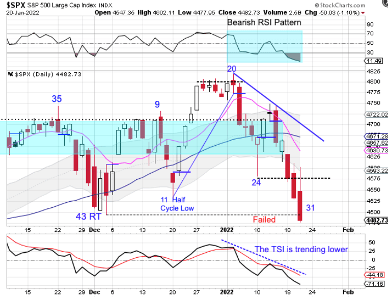 Breaking below the previous daily cycle low forms a failed daily cycle. In the Weekend Report I plan to discuss how the failed daily cycle impacts the status of the intermediate cycle as well as the status of the yearly cycle.