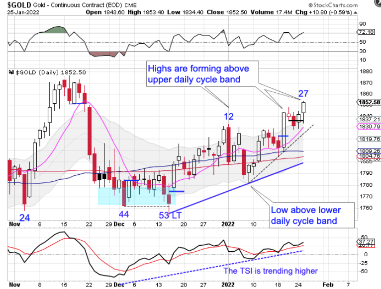 Prior to printing the late December DCL, gold was in a pattern of printing lows below the lower daily cycle band. That is characteristic of a daily downtrend. Since the late December low that pattern has changed. Gold is now forming highs above the upper daily cycle band and lows are now forming above the lower daily cycle band. This is characteristic of gold being in a daily uptrend. Gold will remain in its daily uptrend unless it closes below the lower daily cycle band.