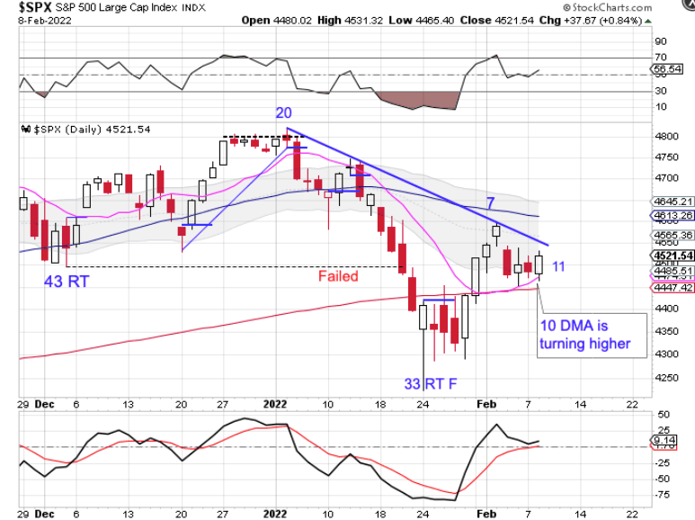 We discussed last week that the market probably needed to consolidate between the 50 day MA and the 200 day MA to allow the day 10 MA to turn higher.