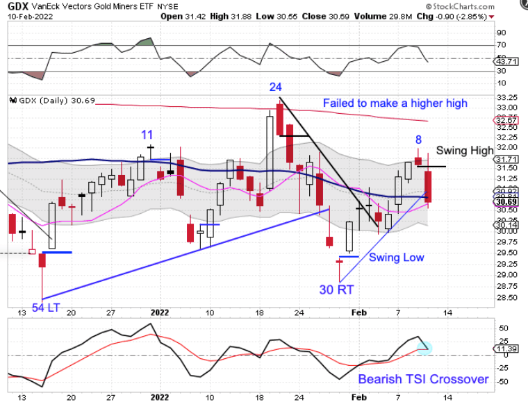 The Miners formed a swing high on Thursday. They failed to make a higher high and now have closed below the 50 day MA. A peak on day 8 sets up the Miners for a left translated daily cycle formation which signals a continuation of the intermediate cycle decline. The Miners are currently in a daily downtrend. Forming a swing high below the upper daily cycle band indicates a continuation of the daily downtrend and triggers a cycle band sell signal.