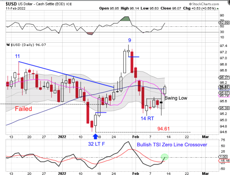 The dollar formed a swing low on Tuesday. It delivered bullish follow through by closing above both the 10 day MA and the 50 day MA on Friday to signal that day 14 was the DCL. The dollar is currently in a daily downtrend. The dollar will remain in its daily downtrend unless it closes back above the upper daily cycle band.