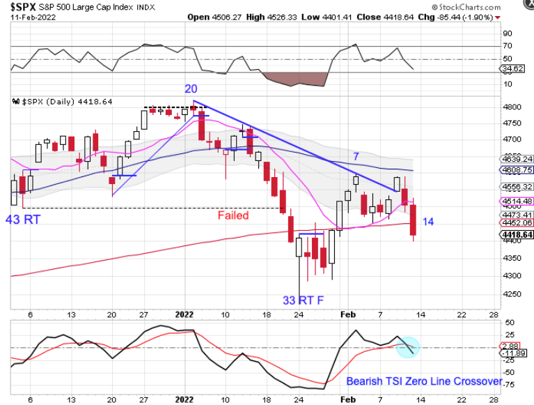With a peak on day 7, losing the 200 day MA on Friday sets stocks up for a left translated daily cycle formation and a continuation of the intermediate cycle decline. Stocks are currently in a daily downtrend. They will remain in their daily downtrend unless they close back above the upper daily cycle band.
