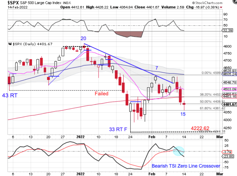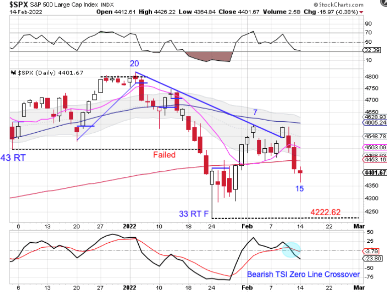 The peak on day 7 indicates a left translated daily cycle formation. A break below the previous daily cycle low of 4222.62 will form a failed daily cycle to extend the intermediate cycle decline. However stocks formed a bullish reversal on Monday.