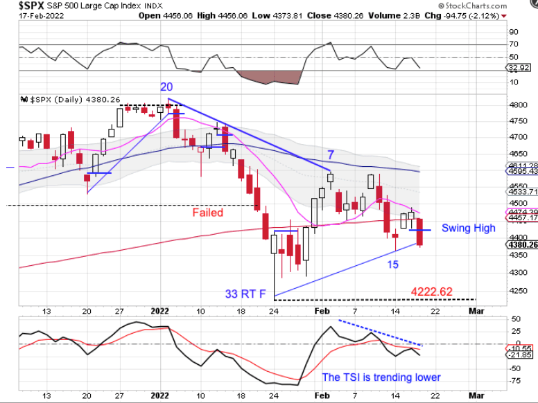 Stocks are currently in a daily downtrend that is characterized by highs forming below the upper daily cycle band and lows forming below the lower daily cycle band. Forming a swing high below the lower daily cycle band indicates a continuation of the daily downtrend and triggers a cycle band sell signal. The peak on day 7 sets stocks up for a left translated daily cycle formation. A break below the previous daily cycle low of 4222.62 will form a failed daily cycle.