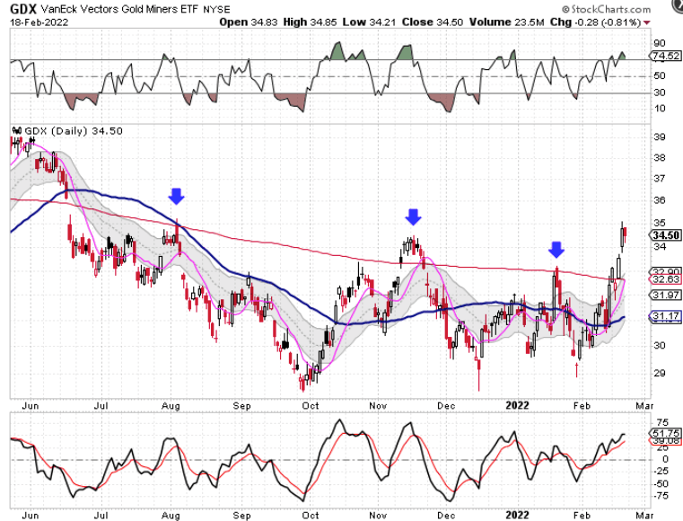 The Miners closed above the 200 day MA on Monday then delivered bullish follow through on Wednesday and Thursday. The Miners are in a daily uptrend and will remain so unless they close below the lower daily cycle band.