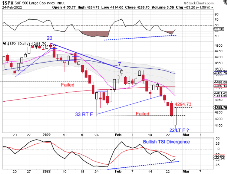 Thursday was only day 22 for the daily equity cycle, placing stocks about 2 weeks shy of its normal timing band for a daily cycle low. However, stocks formed a convincing bullish reversal on Thursday that regained its breakdown level. If stocks form a swing low, that will signal an early DCL. A break above 4294.73 will form a daily swing low. Then a close above the 10 day MA will have us label day 22 as the DCL. Stocks will still need to break above both the 200 day MA and the 50 day MA before a trending move can develop.
