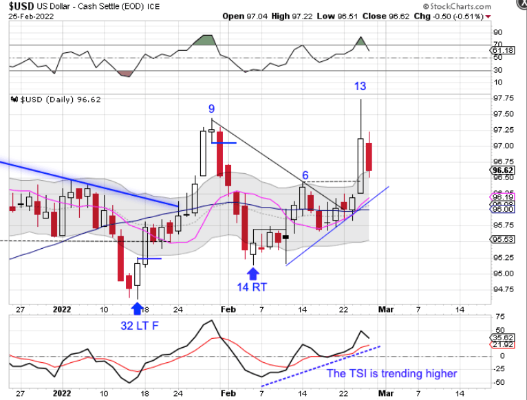 Thursday was day 13 for the daily dollar cycle. The new high on day 13 shifts the odds towards a right translated daily cycle formation. The dollar closed above the upper daily cycle band on Thursday. Closing back above the upper daily cycle band ends the daily downtrend and begins a new daily uptrend.