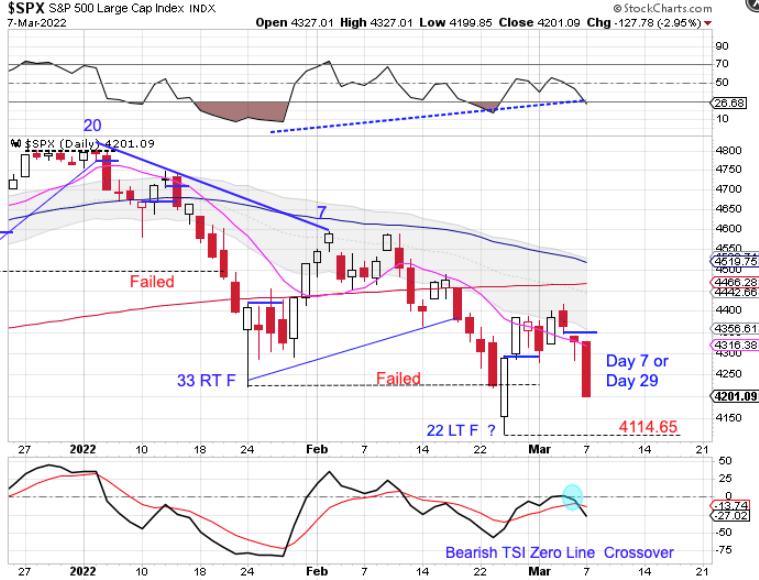 Stocks needed to close above the 10 day MA and turn it higher to confirm that day 22 was the DCL. Instead, stocks broke lower on Monday. Breaking lower signals a continuation of the daily cycle decline which would make Monday — day 29. Stocks will likely need to break below the day 22 low of 4114.65 in order to complete their daily cycle decline.