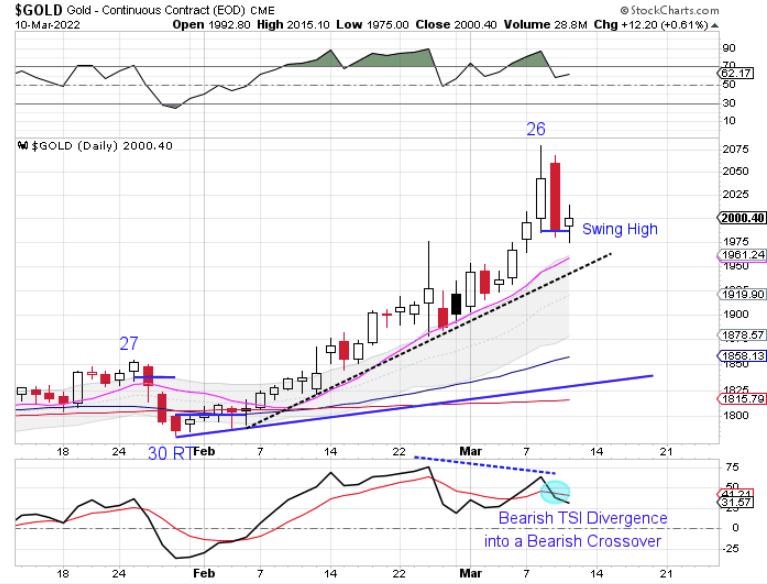 Gold formed a swing high on Wednesday, day 27, placing gold in its timing band for a DCL.