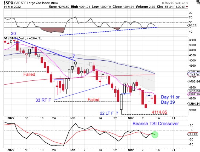 Stocks still need to break bullishly above the 10 day MA and turn it higher to confirm day 22 as the DCL. However stocks being in a daily downtrend and contained by the declining 10 day MA makes it more likely that Friday was day 39. A break below the day 22 low of 4114.65 will extend the daily cycle decline.