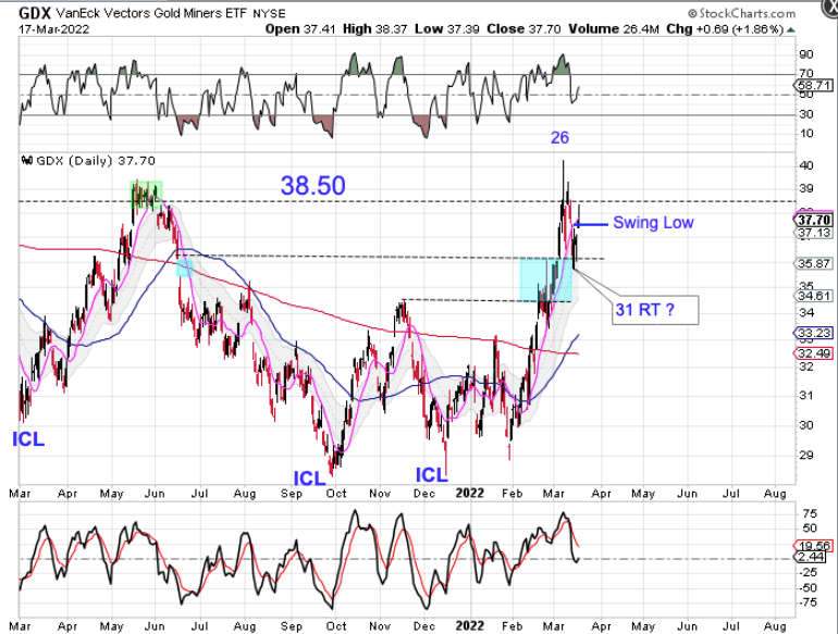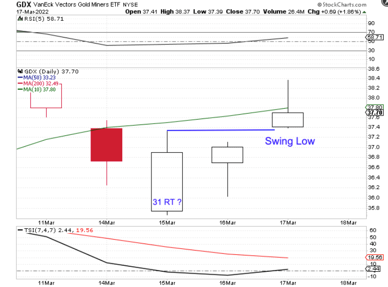 The Miners printed their lowest point on Tuesday, day 31, placing them in their timing band for a DCL. A close above the 10 day MA will signal the new daily cycle.