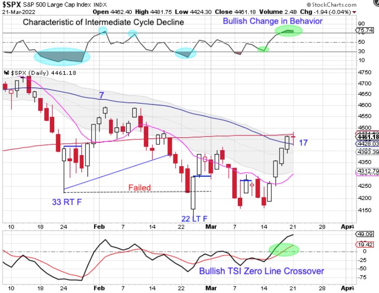 RSI 05 would embed in oversold and quickly reverse from overbought as stocks were seeking out their ICL. That behavior has changed since the day 22 DCL. Since then RSI 05 has quickly reversed once oversold and is now starting to embed in overbought – which is characteristic of an intermediate cycle advance. Stocks will need to close above the 200 day MA for a trending move to develop.