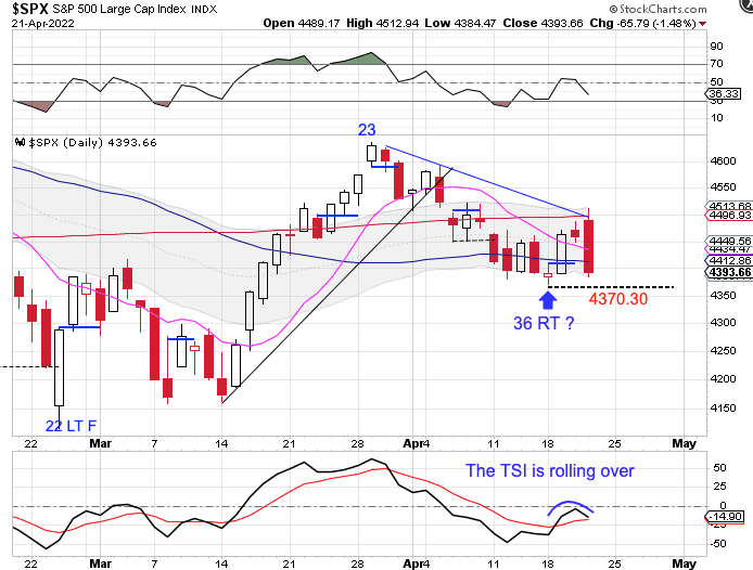 Stocks printed their lowest point on Monday, day 36, placing them in their timing band for a DCL. Stocks formed a swing low and closed above both the 50 day MA and 10 day MA on Tuesday. This, in real time, looked like stocks printed their DCL. Stocks still needed to break above the declining trend line and turn the 10 day MA higher for final confirmation of the DCL. Being rejected by the 200 day MA and closing below both the 10 day MA and the 50 day MA indicates that stocks are still in the process of seeking out their DCL. A break below the day 36 low of 4370.30 will signal a continuation of the daily cycle decline.