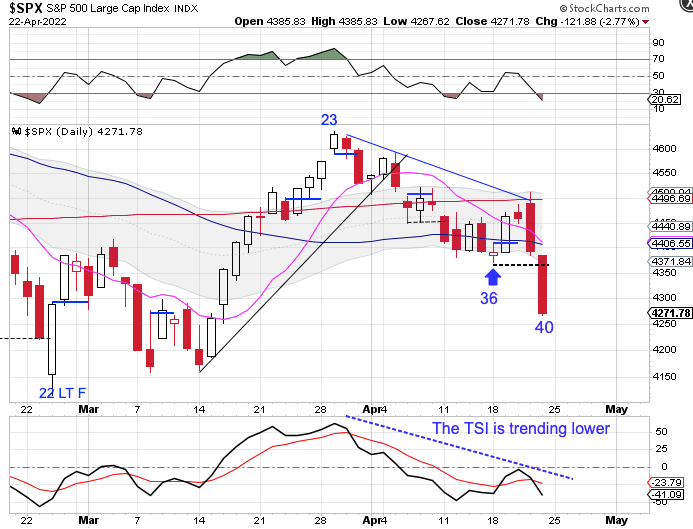 Stocks printed their lowest point on Friday, day 40, placing stocks deep in their timing band for a DCL. After the 2.77% drop on Friday, stocks would benefit from a narrow range lower low which would ease the parameters for forming a swing low. A swing low and recovery of the 10 day MA will signal the new daily cycle. Stocks are currently in a daily downtrend. Stocks will remain in their daily downtrend unless they close back above the upper daily cycle band.