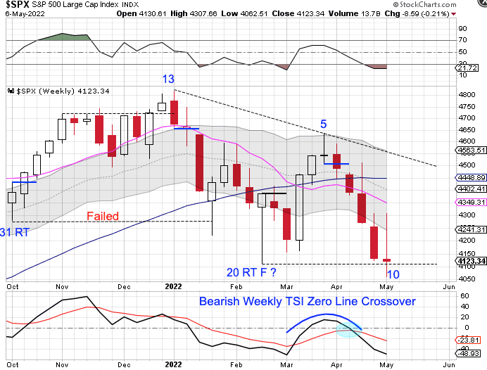 If February was the yearly cycle low, then the first intermediate cycle should right translate. Instead, stocks peaked on what would have been week 5 then went on to break below the February low this week.