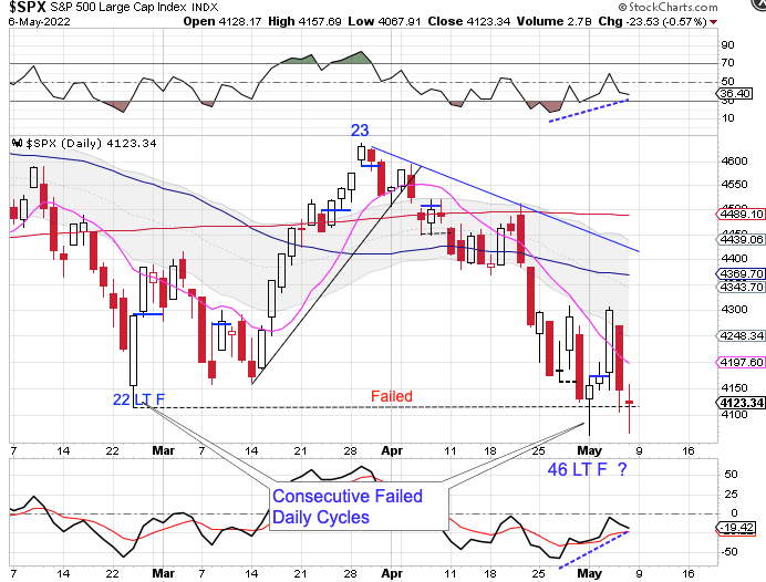 And – if February was the intermediate cycle low, then the first daily cycle should right translate. Instead, stocks printed consecutive failed daily cycles, beginning a pattern of lower lows.
