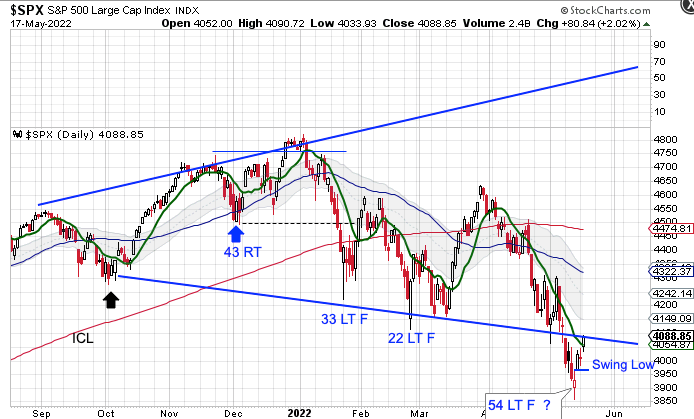 Stocks printed their lowest point on day 54, placing stocks deep in their timing band for a DCL. Closing above the 10 day MA indicates that day 54 was the DCL. A close above the lower trend line will have us label day 54 as the DCL which should allow stocks to start to gain some bullish traction.