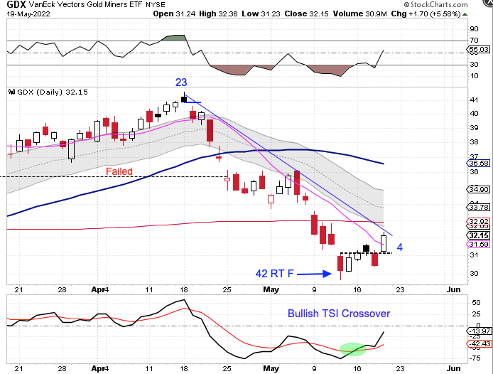 The Miners printed their lowest point on day 42, placing them deep in their timing band for a DCL. The Miners formed a swing low on Monday then delivered bullish follow through by closing above the 10 day MA on Thursday to signal that day 42 was the daily cycle low. The Miners will need to break above the declining trend line and the 200 day MA in order for a trending move to develop. In the Weekend Report I will discuss what this means in terms of the longer, intermediate cycle.