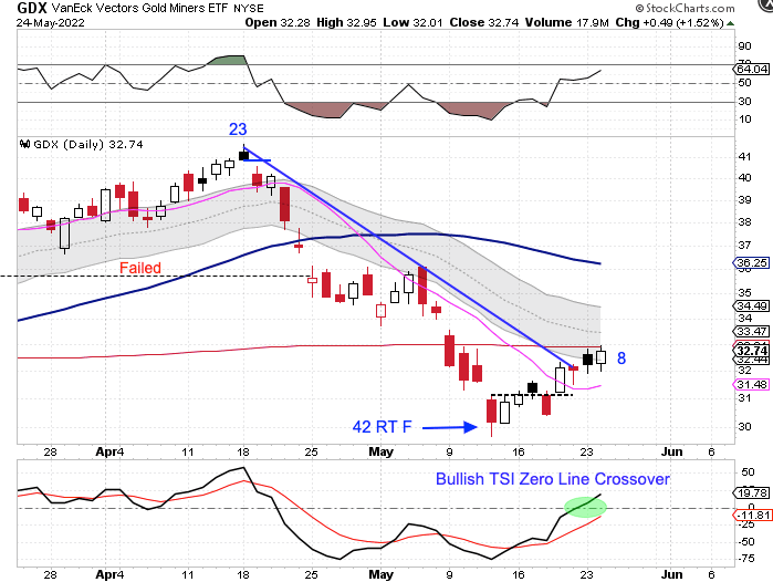 The Miners broke above the declining trend line on Monday, further confirming that day 42 hosted the DCL. Now the Miners are running into resistance at the 200 day MA. The Miners will need to break above the 200 day MA in order for a trending move to develop.