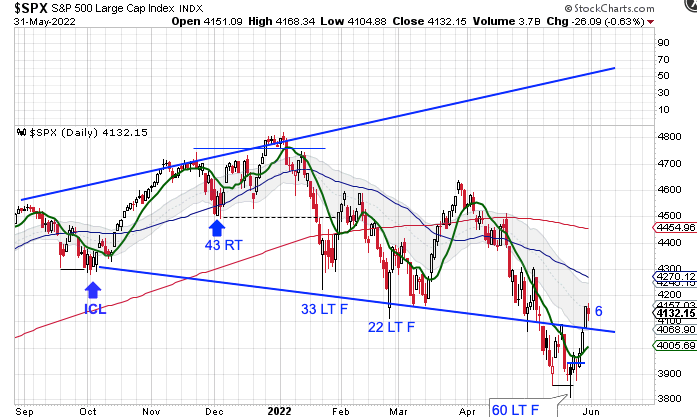 Stocks had a big week last week, rallying for 6.58% to close back above the lower stem of the megaphone topping pattern on Friday.