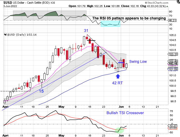 The dollar printed its lowest point on Tuesday, day 42, placing placing the dollar very deep in its timing band for a DCL. Wednesday’s swing low and close above the 10 day MA signals the new daily cycle. Notice that the RSI 05 pattern is changing – which indicates that the dollar is beginning the declining phase of its intermediate cycle. That aligns with the dollar being in a daily downtrend. The dollar will remain in its daily downtrend unless it closes back above the upper daily cycle band.
