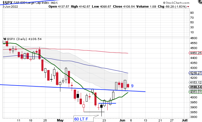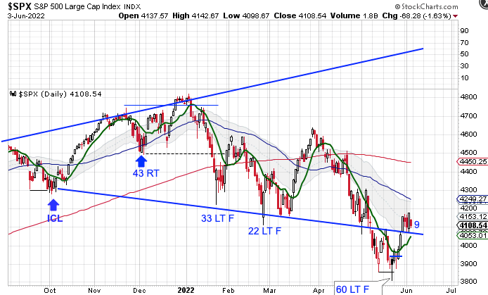 The rally out of the day 60 DCL had stocks close back above the lower trend line of the megaphone pattern.