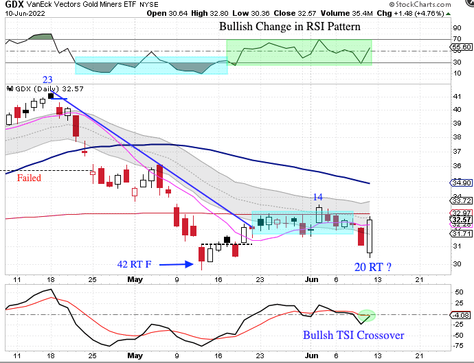 The Miners printed a huge bullish engulfing candle on Friday. A close back above the 200 day MA would complete a reversal of the bearish breakdown and should result in a trending move — which we would then label day 20 as the DCL.
