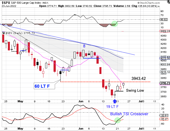 Stocks printed their lowest point on Friday, day 19, which is very early for a DCL. But with the previous daily cycle being stretched at 60 days, a shortened daily cycle would help to balance out the cycle counts. We will Thursday’s close above the 10 day MA to label day 19 as an early DCL. Stocks still need to break above the 3943 resistance level and turn the 10 day MA higher to be assured that day 19 did, indeed, host an early DCL.