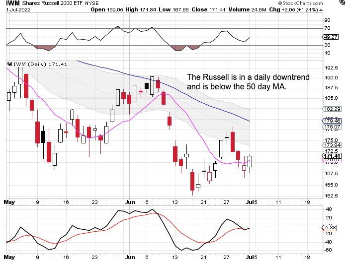 The Russell also formed a swing low and closed back above the 10 day MA on Friday. But still remains below the 50 day MA and is in a daily downtrend.