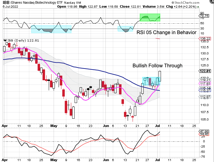 Prior to the June low, RSI 05 was in a bearish pattern – embedding in oversold and quickly reversing once overbought. That is changing. RSI 05 is beginning to embed in overbought – which is characteristic of an intermediate cycle advance. That aligns with Biotech being in daily uptrend. Biotech will remain in its daily uptrend unless it close below the lower daily cycle band.