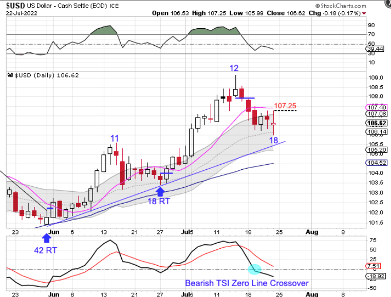 Friday was day 18 for the daily dollar cycle, which places the dollar in the early part of its timing band for a DCL. The dollar really needs to turn the 10 day MA lower to signal the daily cycle decline. However, the dollar is currently in a daily uptrend. If the dollar forms a swing low above the lower daily cycle band then it will remain in its daily uptrend and signal a cycle band buy signal — in which we would label day 18 as a half cycle low. A break above 107.25 will form a daily swing low.