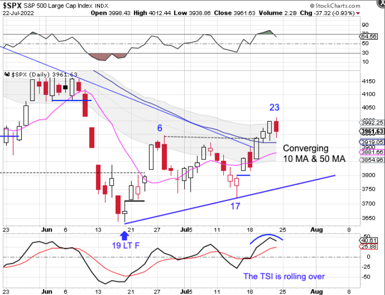 The new high on day 23 assures us of a right translated daily cycle. Stocks are a bit stretched above the 10 day MA and may crawl along the 50 day MA to allow the 10 day MA to catch up to price. However, a close below the converging 10 day MA and 50 day MA would signal the daily cycle decline. Stocks are currently in a daily uptrend. They will remain in their daily uptrend unless they close below the lower daily cycle band.