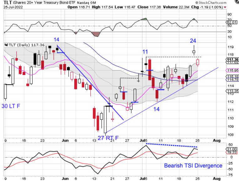 Monday was day 25 for the daily bond cycle, placing it in the early part of its timing band for a daily cycle low. Losing the breakout indicates that bonds are feeling the gravitational pull of the pending DCL.