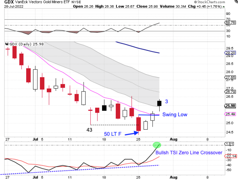 The Miners formed a swing low and closed above the 10 day MA on Wednesday. The Miners delivered bullish follow through on Thursday by closing a full candle body above the 10 day MA so we will label day 50 as the daily cycle low.