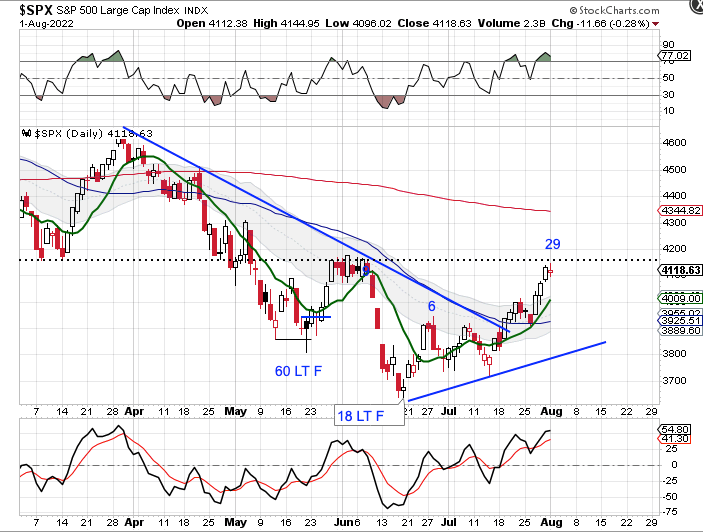 At 29 days, stocks are in the early part of their timing band for a DCL. Stocks are getting stretched above the 10 day MA and they are running into resistance at the 4150 level. If stocks can break through this resistance then there is little to stop them for testing the 200 day MA. But, rejection by the 4150 resistance level would signal the daily cycle decline. Stocks are currently in a daily uptrend. Stocks will remain in their daily uptrend unless they close below the lower daily cycle band.