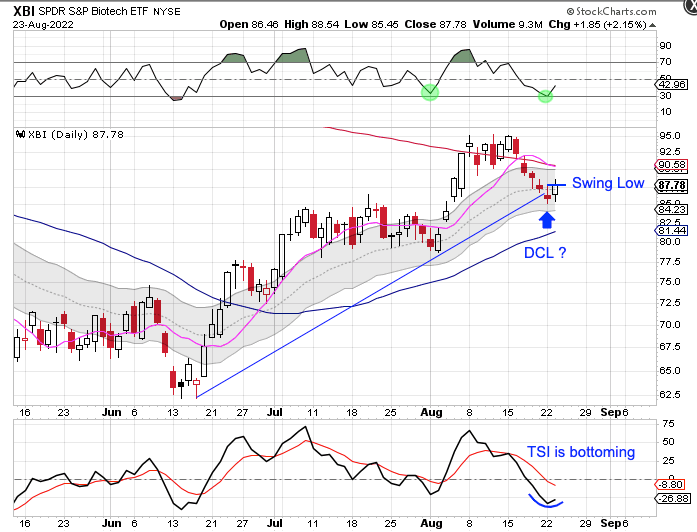 Biotech has been in a daily uptrend that has been characterized by highs forming above the upper daily cycle band and lows forming above the lower daily cycle band. Biotech formed a daily swing low on Tuesday. Forming a swing low above the lower daily cycle band indicates a continuation of the daily uptrend and signals a cycle band buy signal. Long entries can be entered with a stop at Monday’s low.