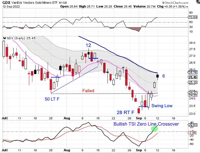 The Miners formed a swing low on last Wednesday then closed above the 10 day MA on Thursday to signal the new daily cycle. The Miners proceeded to deliver bullish follow through to see them testing the declining 50 day MA on Monday.