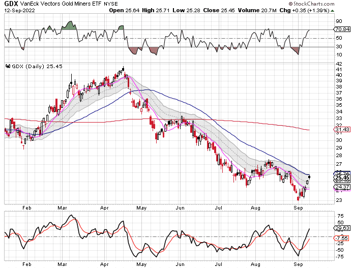 The Miners lost the 50 day MA back in April. We could see the Miners trade sideways to allow the 50 day MA to flatten out. No trending move will be able to gain any traction until the Miners are able to close back above the declining 50 day MA. The Miners are currently in a daily downtrend. The Miners will remain in their daily downtrend unless they close above the upper daily cycle band.