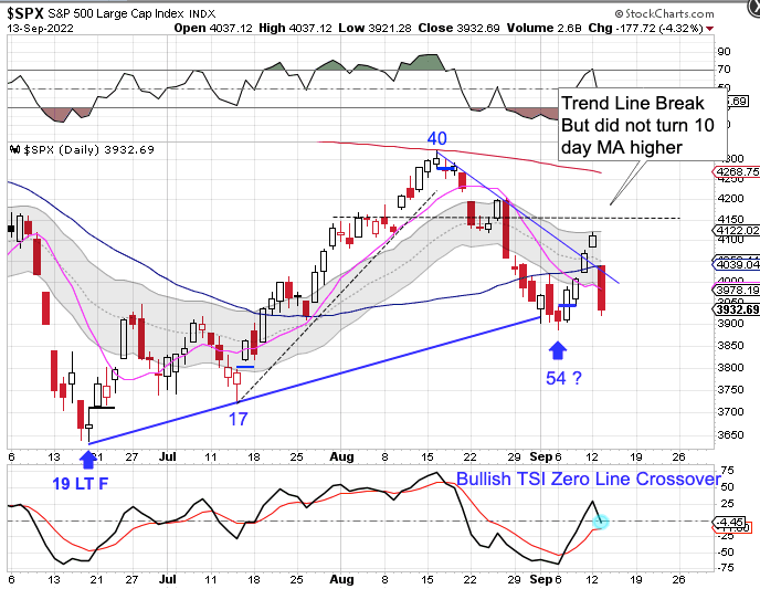 Over the past 8 years there has been precedence for a stretched daily cycle to get past 58 days to 60 even 61 days. However, there has not been one instance where a daily cycle peaked on day 4. And the fact that the 10 day MA did not turn up makes it likely that Tuesday was day 58 of a very stretched daily cycle. Under this scenario, stocks are likely to undercut the day 54 low before printing their DCL. What is clear is that stocks are still in a daily downtrend. They will remain in their daily downtrend until the can close above the upper daily cycle band.