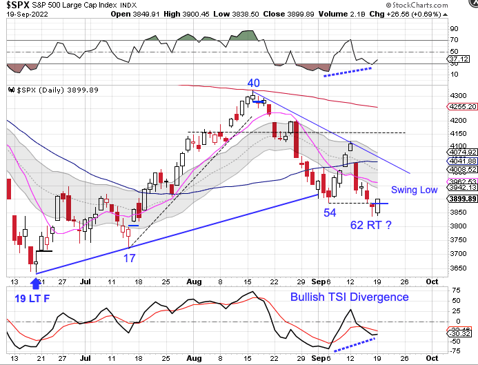 Stocks undercut the day 54 low on Friday. Monday’s swing low recovered the breakdown level to indicate that day 62 was the DCL. A close back above the 10 day MA will provide more assurance that day 62 was the DCL. But we will really need to see a close above the declining trend line in order to label day 62 as the DCL.