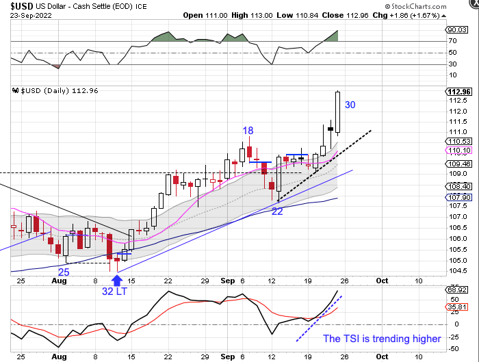 Friday was day 30 for the dollar’s daily cycle. The new high on day 30 locks in a right translated daily cycle formation. 30 days also places the dollar in its timing band for a daily cycle decline. The dollar will need to form a swing high and break below the accelerated (dashed) trend line to signal the daily cycle decline. The dollar is currently in a strong daily uptrend. The dollar will remain in its daily uptrend unless it closes below the lower daily cycle band.