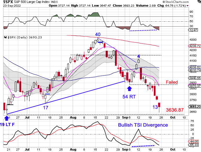 When stocks formed a swing low on Monday it looked, in real time, that the undercut-extended daily cycle low scenario was valid. Then stocks were rejected by the breakdown level on Wednesday then delivered bearish follow through on Thursday and Friday. Therefore we will label day 54 as the DCL, making Friday day 13 of a failed daily cycle. And losing the breakdown level signals that stocks have entered a bloodbath phase. A break below the previous DCL of 3636.87 will form a failed daily cycle to signal the intermediate cycle decline.